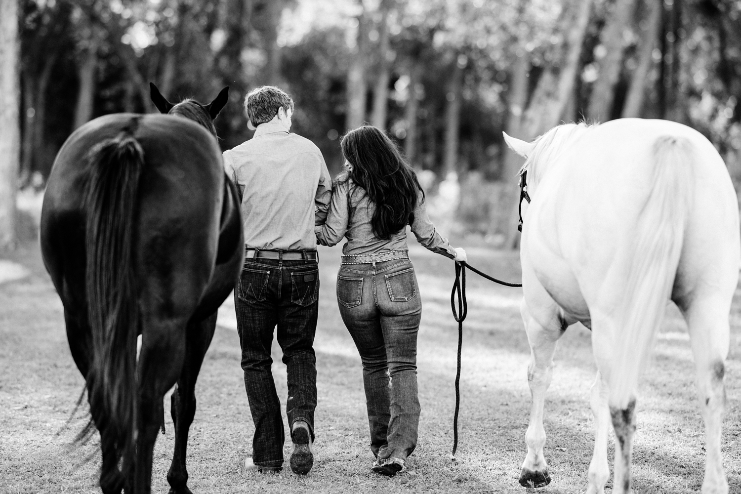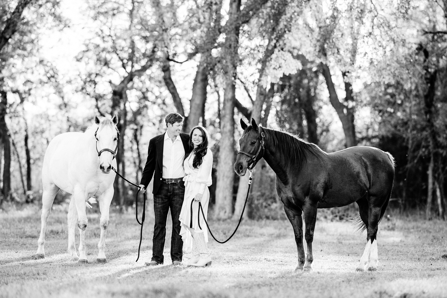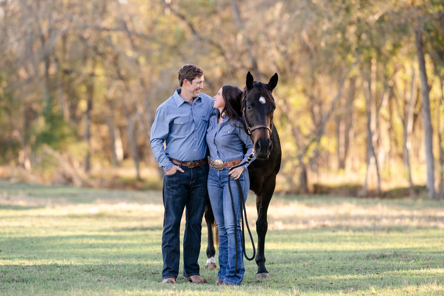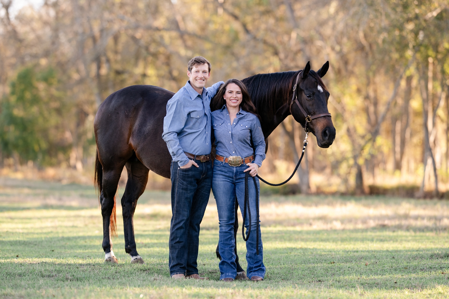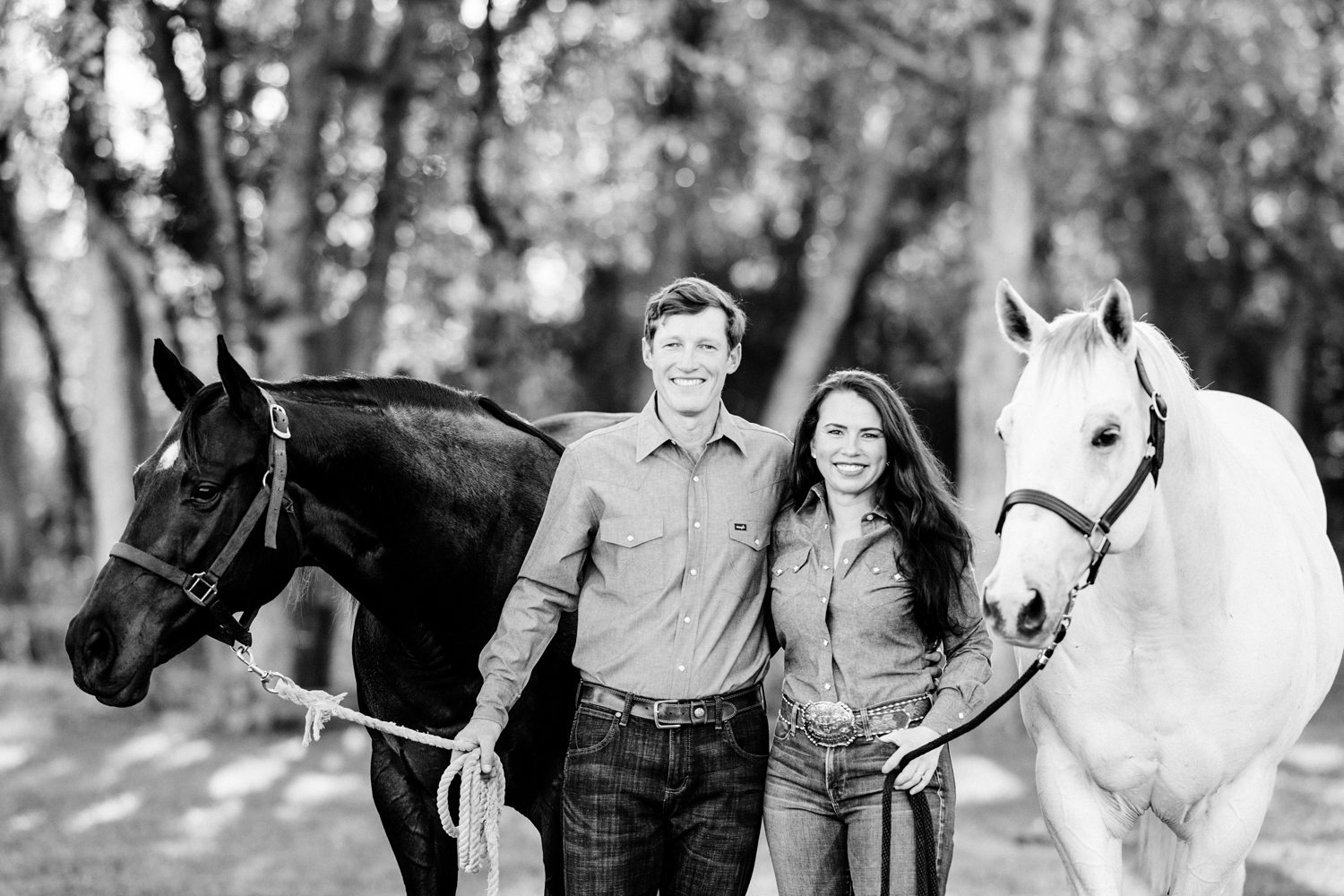 Taryn Sheldon and Ted Maas celebrating their engagement with their AQHA racing horses in Elgin, Texas.